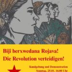 Damals wie heute – Aktionsaufruf zum 26. Januar! Vor 11 Jahren am 26. Januar 2015 wurde nach monatelangen Kämpfen die Stadt Kobane vom Terror des sogenannten IS befreit. Gemeinsam konnten die Selbstverteidigungskräfte YPJ und YPG sowie die Bevölkerung vor Ort, unterstützt von weltweiter Solidarität, die grausamen Angriffe abwehren und Stück für Stück die Dschihadisten zurückdrängen. …