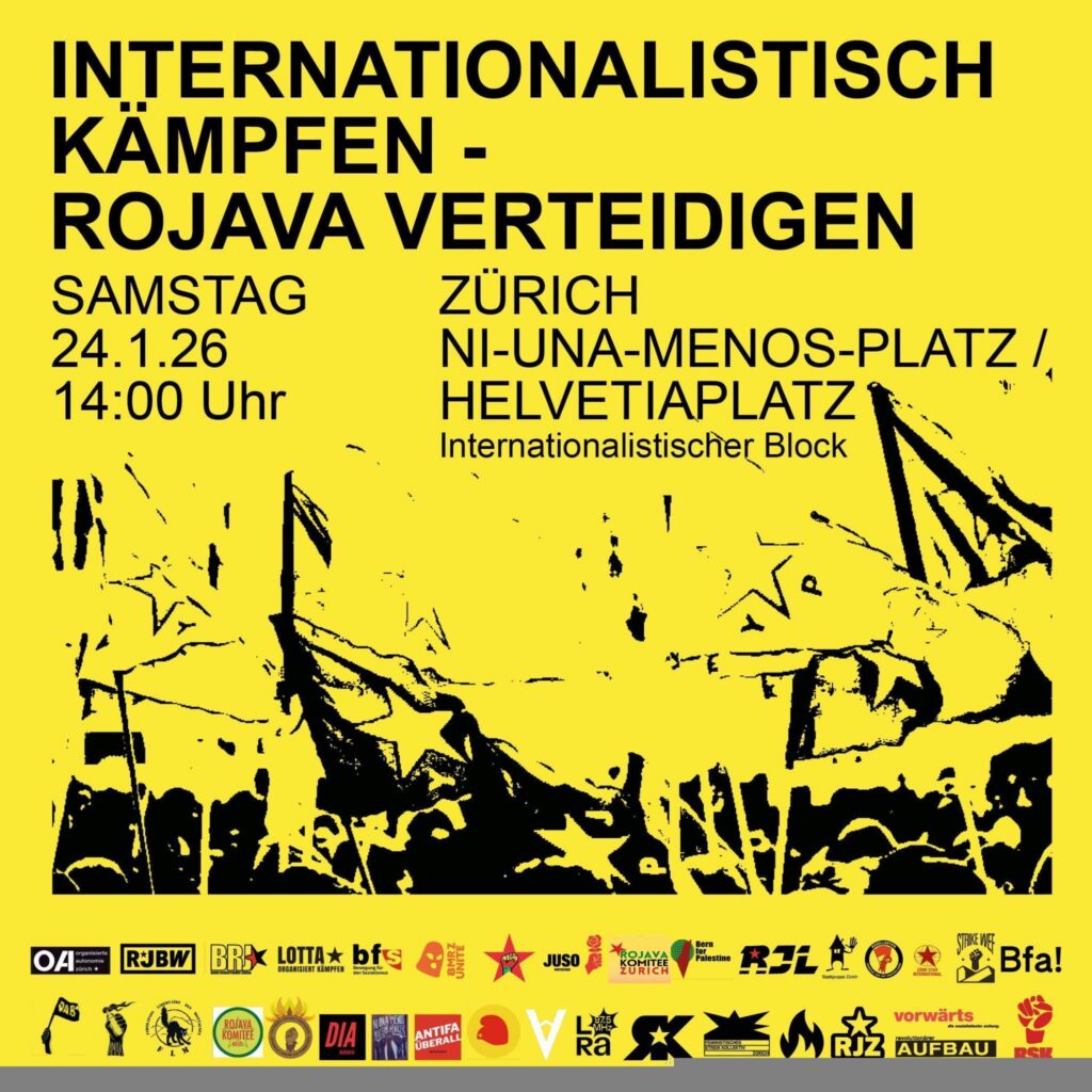 Liebe Freund*innen und Genoss*innen Die kurdischen Städte Kobanê, Haseke und Qamislo in Nord- und Ostsyrien sind unter heftigen Angriff. Die islamistische Regierung lässt IS-Gefangenen frei. Jetzt müssen wir Rojava gemeinsam verteidigen. Kommt alle an die schweizweite Demo diesen Samstag, 24. Januar 2026 um 14 Uhr auf den NiUnaMenos-/Helvetia-Platz in Zürich! Die Situation in Rojava spitzt sich immer mehr zu – die Menschen vor Ort leisten Widerstand, um das revolutionäre Projekt, ihre Hoffnung, ihre Würde und ihre Existenz zu verteidigen. Und weltweit wächst die internationale Solidarität, auch in der Schweiz finden täglich Demonstrationen und Aktionen in mehreren Städten gleichzeitig statt. Wir […]