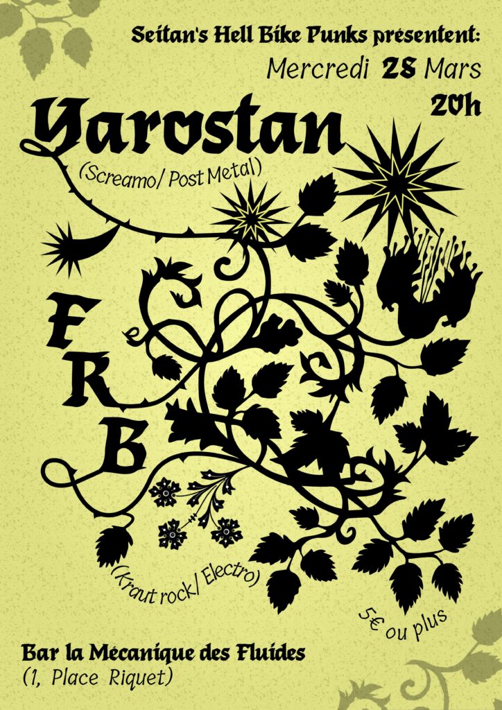 First show in this apocaliptic year. March 25th, 20h: Yarostan (Post Metal / Screamo)https://yarostan.bandcamp.com FRB (Kraut Rock / Electronics)https://frb-band.bandcamp.com Bar La Mécanique des Fluides5€ or more