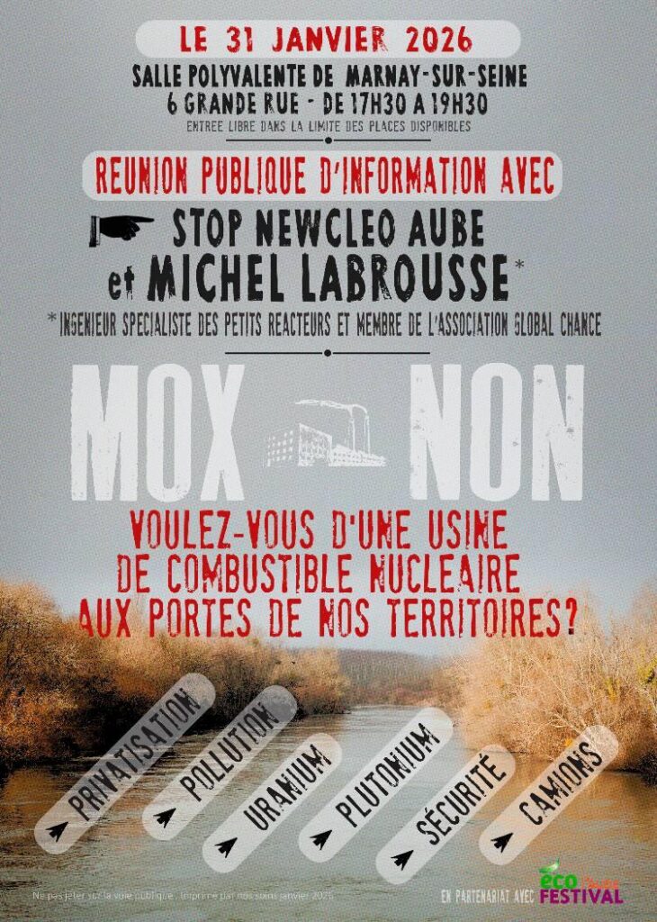 Voulez-vous d’une usine de combustible nucléaire aux portes de nos territoires ? Alors que le débat public se précise autour du projet d’usine de combustible MOX porté par l’entreprise Newcleo dans nos territoires, le collectif Stop Newcleo Aube vous invite à une réunion publique d’information avec Michel Labrousse, ancien membre du CEA (Commissariat à l’Énergie Atomique) et membre de l’association scientifique Global Chance. Quelle est la technologie Newcleo, sa filière et ses avancées ? Le projet Newcleo est-il viable et réalisable dans les temps annoncés ? Quel avenir se dessine pour nos territoires ? Et pour quels dangers? Venez nombreux […]