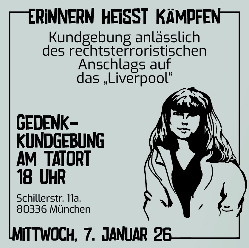 Wir hatten gehofft, dass die Stadt München das Gedenken an Corinna Tartarotti – wie in den vergangenen zwei Jahren – dauerhaft übernimmt. Und doch richten wir es im kommenden Jahr in Absprache mit der Stadt München wieder selbst aus. Wir tun das zuvorderst, weil wir es wichtig finden, dass das Erinnern an die Opfer und Betroffenen der „Gruppe Ludwig“ kontinuierlich und sichtbar weitergeführt wird. Unser Gedenken soll eine radikale, antifaschistische und feministische Perspektive einnehmen, die nicht nur erinnert, sondern aktiv in die Gegenwart wirkt und der Verharmlosung entgegensteht. Dass sich die Verwaltung aus der Organisation des Gedenkens am Tatort zurückzieht, […]