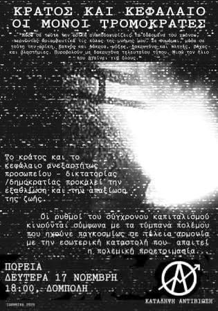 DOWN WITH THE POWER – GENERAL REVOLT THEN, NOW AND FOREVER KYRIAKOS IS ONE OF US, A COMRADE FOREVER ON THE STREETS OF FIRE SQUARE, STREFF IHILL, POLYTEXNEIO , AND EXARCHEIA DO NOT STAY IN MUSEUMS INSURRECTION IN THE PRESENT AND NOW AGAINST THE INTERNATIONAL OF FASCISM NEITHER FASCISM NOR DEMOCRACY, DOWN WITH STATE LONG LIVE ANARCHY! Monday 17 November : Athens : Klathmonos Square, 15:00 PM – Pre- Gathering at the Polytechnic University, 13:00 PM Open anarchist assembly for November 17, 2025