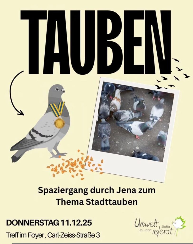“Die Ratten der Lüfte”, “Die machen doch nur Dreck”, “Ekelviecher”Stadttauben müssen viel über sich ergehen lassen – Beschimpfungen, Tritte oder einfach ignoriert werden. Sie leiden im Stillen. Was steckt dahinter? Woher kommen unsere stetigen Mitbewohnerinnen in den Städten? Vor noch 70 Jahren wurden Tauben gepriesen und verehrt und haben sogar Orden erhalten. Was ist in dieser Zeit passiert? Bei unserem Spaziergang durch Jena startend am Foyer in der Carl-Zeiss-Straße 3 wollen wir, das Umweltreferat und die Tierbefreierinnen Jena, Sie einladen mehr auf Stadttauben und den Umgang von Menschen mit ihnen zu achten. Dabei Besprechen wir nicht nur was Stadttauben sind, […]