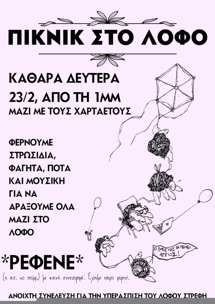 23.2 η καθιερωμένη καθαρά Δευτέρα στον λόφο Στρέφη! Όπως κάθε χρόνο έτσι και φέτος παρά την μπατσοκρατία φέρνουμε τα βιγκαν φαγητά μας και πετάμε τους χαρταετούς μας ψηλά! Μοιραζόμαστε και αγωνιζόμαστε παρέα, οικειοποιούμαστε νέα και παλιά λημέρια σε κάθε γωνιά του λόφου! Σας περιμένουμε από τη 1.00