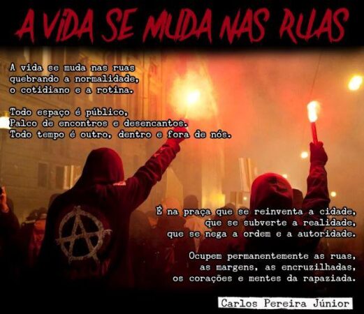 . A vida se muda nas ruas quebrando a normalidade, o cotidiano e a rotina. . Todo espaço é público, Palco de encontros e desencantos. Todo tempo é outro, dentro e fora de nós. . É na praça que se reinventa a cidade, que se subverte a realidade, que se nega a ordem e a autoridade. . Ocupem permanentemente as ruas, as margens, as encruzilhadas, os corações e mentes da rapaziada. . Carlos Pereira Junior agência de notícias anarquistas-ana Joaninha em meu braçoVovó viu e falouVem sorte por aí Francieli da Silva