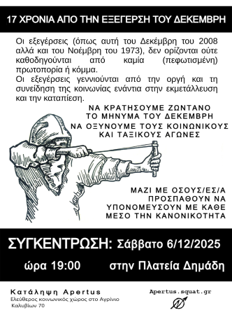17 ANOS APÓS A REVOLTA DE DEZEMBRO As revoltas (como a de dezembro de 2008, mas também a de novembro de 1973) não são definidas nem guiadas por nenhuma vanguarda ou partido (iluminado). As revoltas nascem da raiva e da consciência da sociedade contra a exploração e a opressão. MANTENHAMOS VIVA A MENSAGEM DE DEZEMBRO AGUDIZAR AS LUTAS SOCIAIS E DE CLASSE JUNTO COM AQUELES/AS QUE TENTAM MINAR COM TODOS OS MEIOS, A NORMALIDADE CONCENTRAÇÃO: Sábado, 06/12/2025, às 19h00 na Praça Dimadi Okupação Apertus Espaço Social Livre em Agrínio Kalyvion 70 apertus.squat.gr Conteúdo relacionado: https://noticiasanarquistas.noblogs.org/post/2025/12/02/grecia-alexis-grigoropoulos-um-de-nos/ agência de notícias anarquistas-ana É […]