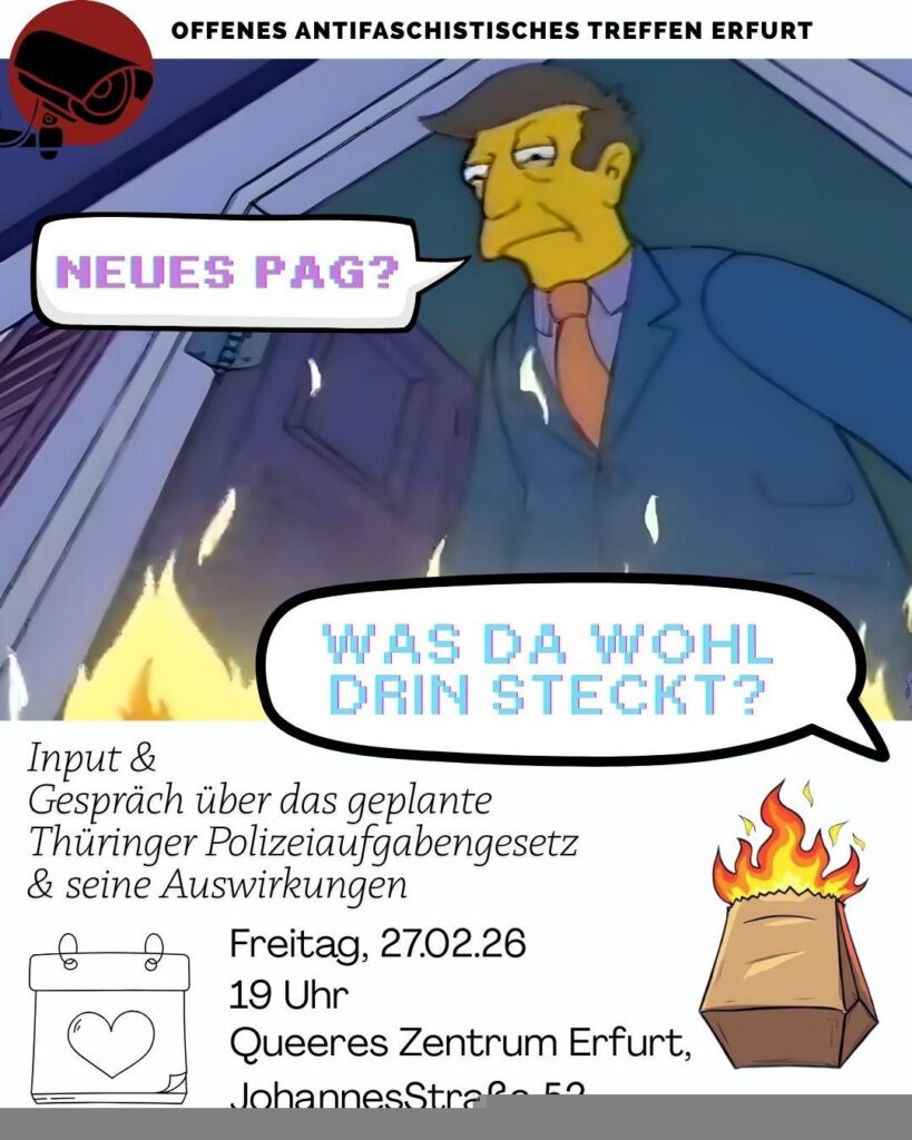 OAT im Februar: NEUES PAG? 🧐 ☑️ 27.02.2026 | ⏰ 19 Uhr | 📍 Queeres Zentrum Erfurt, Johannesstraße 52 Das Jahr hat grad erst angefangen, an allen Ecken brennts, aber wir müssen über den nächsten Haufen, der uns da aufgetischt wird, reden. Es geht um den Entwurf des neuen Thüringer Polizeiaufgabengesetz: Was steckt drin, welche Grundrechte sind betroffen und welche Auswirkungen kann das Gesetz auf unterschiedliche Gruppen haben?Außerdem klären wir: Wo stehen wir aktuell im Gesetzgebungsprozess, und was kommt als Nächstes?Nicht zuletzt werfen wir einen Blick auf bisherige Kampagnen gegen vergleichbare Gesetzesvorhaben (NRW, Bayern, Fußballdemo Leipzig 2025) und fragen, was […]