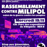 De la Palestine au Soudan, du Congo au Cameroun, des territoires dits “d’outre mer” aux quartiers populaires, de Sainte-Soline aux gilets jaunes… Rassemblement contre Milipol, salon de la guerre contre les peuples À l’heure ou Macron valide la participation de 38 entreprises israéliennes au salon qui doit se tenir du 18 au 21 novembre au parc des expositions de Villepinte, Milipol incarne plus que jamais la guerre globale menée par les États contre les peuples. Les industriels des frontières militarisées, de la surveillance, des prisons, de la répression, des guerres et des génocides, venus du monde entier, s’apprêtent à se […]