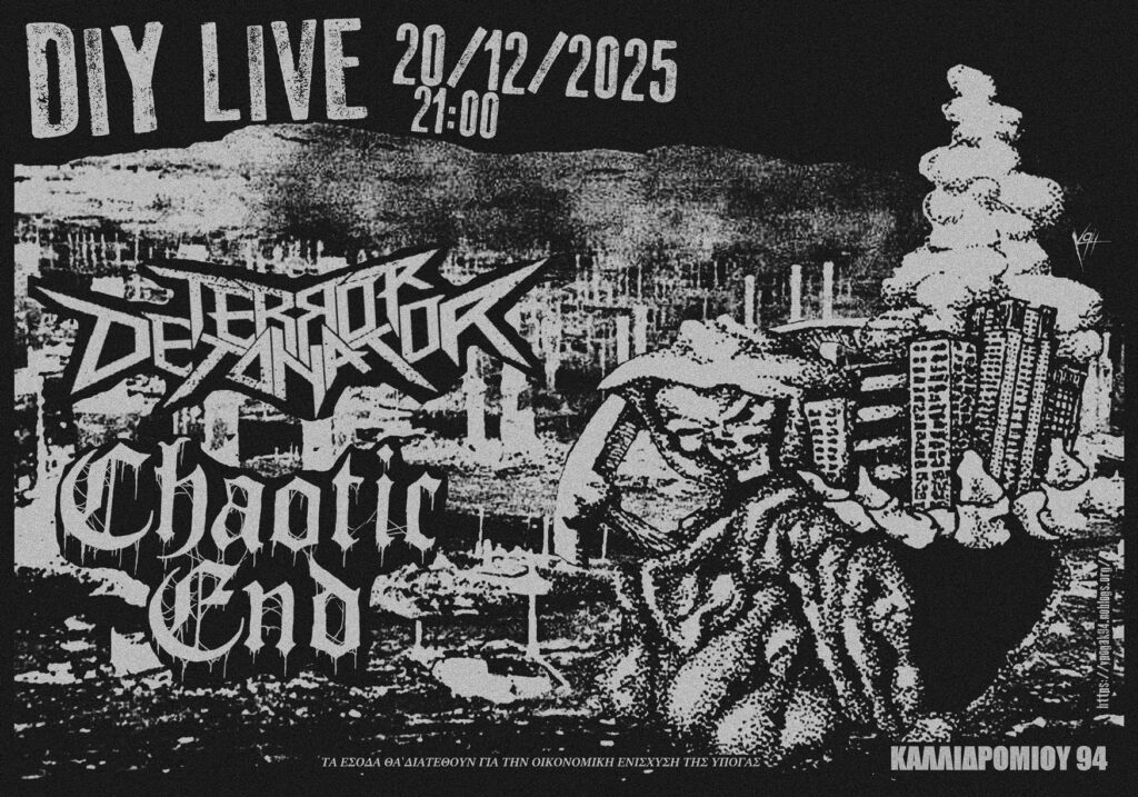 Τελευταίο λάιβ της χρονιάς, το Σάββατο 20.12 με Chaotic End και Terror Detonator από Αθήνα. Θα αρχίσει και θα τελειώσει νωρίς ! Τα έσοδα θα διατεθούν για τη στήριξη της Υπόγας