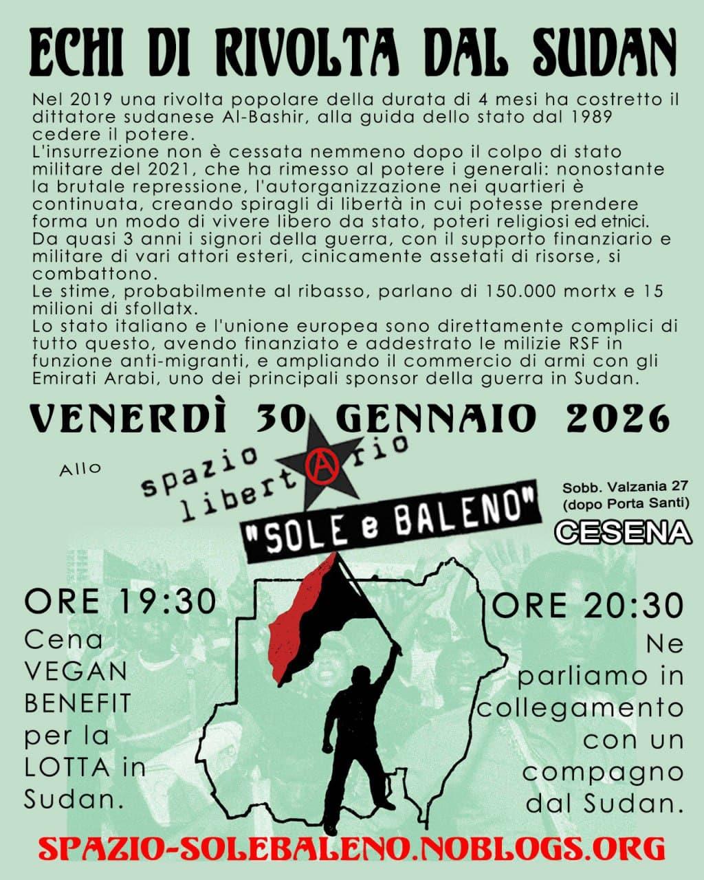 Riceviamo e diffondiamo: VENERDI’ 30 GENNAIO 2026 allo Spazio Libertario “Sole e Baleno”, Sobborgo Valzania 27, Cesena. Ore 19:30 – Cena Vegan BENEFIT PER LA LOTTA IN SUDAN. Ore 20:30 – ECHI DAL SUDAN IN LOTTA. In collegamento con un compagno dal Sudan.