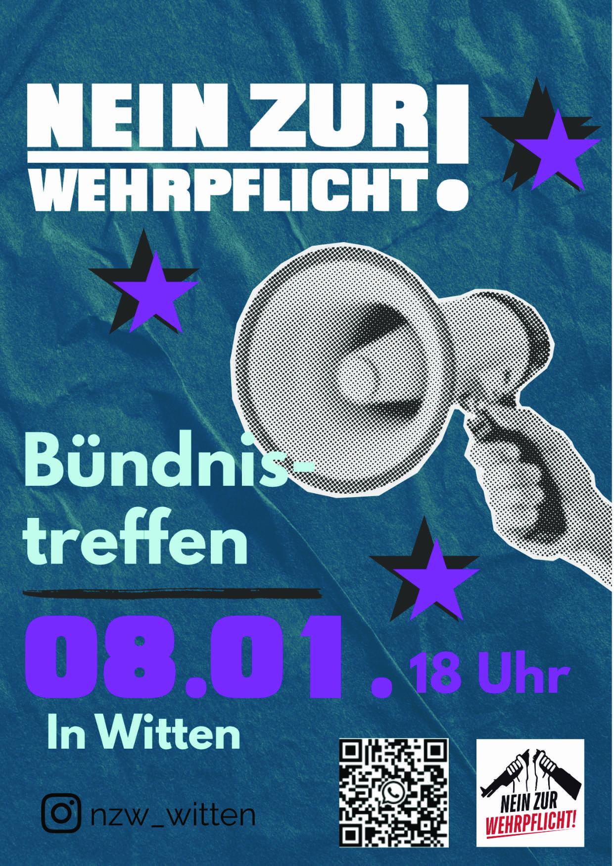 Nein zur Wehrpflicht – Bündnistreffen Am 05.12. wurde, während über 55.000 SchülerInnen dagegen protestierten, das neue Gesetz zum Wehrdienst beschlossen. Wir, das Nein zur Wehrplicht Bündnis, lassen uns davon nicht entmutigen, sondern wollen nun umso deutlicher zeigen, dass wir nicht bereit sind, in einen Krieg zu ziehen, der nicht in unserem Interesse ist. Der nächste Schulstreik soll deshalb auch in Witten stattfinden! Diese Aktion und unser weiteres Vorgehen für das kommende Jahr wollen wir daher am 08.01. um 18 Uhr planen. Die Räumlichkeiten werden auf unserem Instagram (nzw_witten) / WhatsApp Channel (Nein zur Wehrplicht! Witten) bekannt gegeben. Alle Menschen, die […]