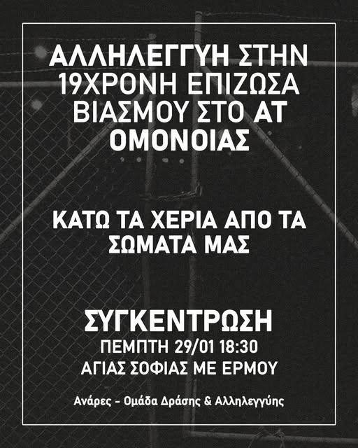 Στηρίζουμε σήμερα στις 19:30 στην πλατεία Αγίας Σοφίας την συγκέντρωση αλληλεγγύης στην -τότε- 19χρονη επιζώσα που βιάστηκε από δύο μπάτσους στο κολαστήριο του ΑΤ Ομονοίας το 2022. Να σταθούμε η μια δίπλα στο άλλο. ΜΠΑΤΣΟΙ ΒΙΑΣΤΕΣ ΔΟΛΟΦΟΝΟΙ Ανάρες, ομάδα δράσης & αλληλεγγύης.