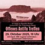 ***English below*** Mittwoch, 29.10.2025 | 19:00 Uhr | Bandito Rosso*, Lottumstraße 10a, 10119 Berlin Mit Input von Widersetzen Berlin: AfD-Jugend verhindern – gemeinsam widersetzen. Außerdem sammeln wir Spenden für die Menschen in der Habersaathstr.! Das Treffen findet als Plenum statt. Im Anschluss ist noch Zeit sich kennenzulernen, kalte Getränke zu kaufen, Sticker zu tauschen und zu kickern. *leider nicht barrierearm (Treppe mit 7 Stufen am Eingang: Außen-Klingel betätigen, wenn ihr Unterstützung braucht!; einzelne Stufen im Innen-Bereich; Holzstühle mit Rückenlehne und ein Sofa; abgetrennter Rauch-Raum, Rückzugs-Raum; englische Flüster-Übersetzungen auf Anfrage) ***English*** OPEN ANTIFA MEETING Wednesday, October 29th 2025 | […]