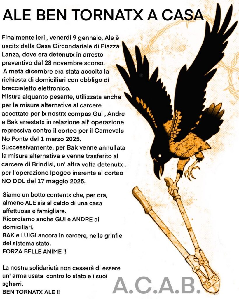Diffondiamo È passato più di un mese e mezzo da quando lx nostrx amicx Luigi, Ale e Bak sono statx arrestatx nel corso dell’Operazione Ipogeo, condotta dalla Procura di Catania lo scorso 20 novembre. Da allora, Luigi e Ale si trovano incarcerati nella gabbia di Piazza Lanza a Catania. Bak in quella di Brindisi. I loro arresti preventivi sono volti a colpire la contestazione al ddl sicurezza adottato lo scorso anno dal governo e contro il quale, il 17 maggio, si è svolto un corteo a Catania, proposto dalla rete cittadina contro il ddl 1660. Come sta accadendo ovunque in […]