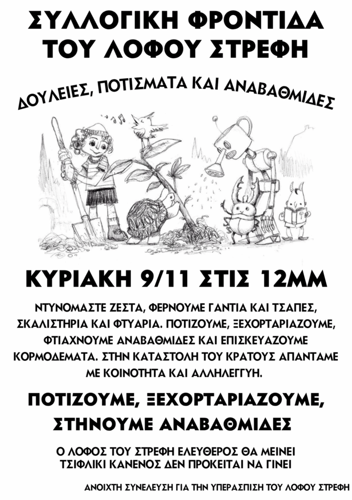 Την Κυριακή 9 Νοέμβρη στις 12:00 συνεχίζουμε τις δουλειές στο Λόφο Στρέφη. Ποτίζουμε και ξεχορταριάζουμε για να αναπτυχθούν οι φυτεύσεις, μεταφυτεύουμε αν χρειαστεί. Στήνουμε αναβαθμίδες στο Λόφο για να τον προστατεύσουμε από την διάβρωση και να προετοιμάσουμε το έδαφος για να ευνοεί φυτά και δέντρα. Επισκευάζουμε κορμοδέματα και καταγράφουμε τι χρειάζεται ο Λόφος. Στην καταστολή του κράτους απαντάμε με κοινότητα και αλληλεγγύη. Ο ΛΟΦΟΣ ΤΟΥ ΣΤΡΕΦΗ ΕΛΕΥΘΕΡΟΣ ΘΑ ΜΕΙΝΕΙ ΤΣΙΦΛΙΚΙ ΚΑΝΕΝΟΣ ΔΕΝ ΠΡΟΚΕΙΤΑΙ ΝΑ ΓΙΝΕΙ ΕΞΩ ΟΙ ΜΠΑΤΣΟΙ ΑΠΟ ΤΟ ΛΟΦΟ ΣΤΡΕΦΗ