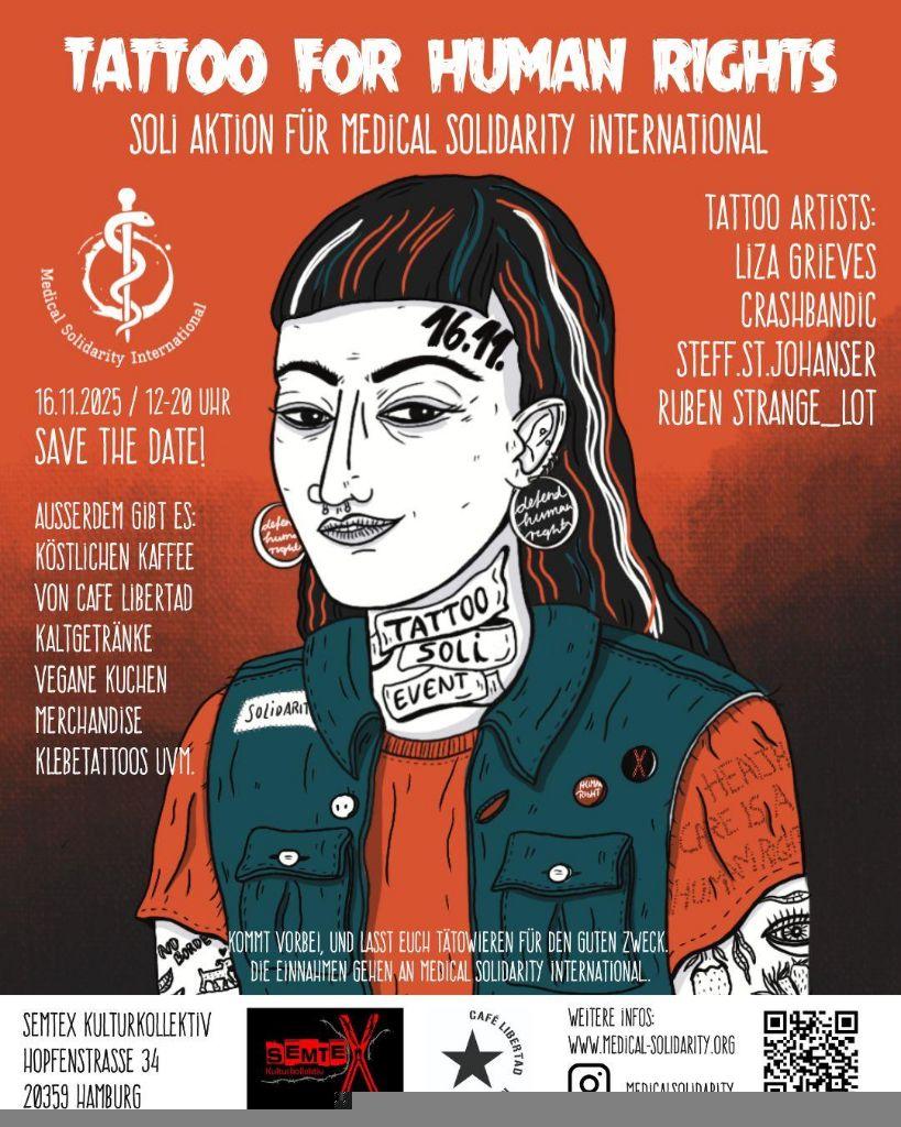 Tätowieren für Menschenrechte! ⚡️Kommt am Sonntag, 16.11.2025 von 12–20 Uhr ins Semtex Kulturkollektiv und setzt gemeinsam mit @liza_grieves_tattoo, @crashbandic , @steff.st.johanser & @Strange_lot ein starkes Zeichen für Solidarität:Es erwarten euch köstlicher Kaffee von @cafe.libertad.kollektiv ☕️, eisgekühlte Drinks 🧃, vegane Kuchen 🍰, Soli-Merchandise 🛍️, Klebe-Tattoos 🖊️ und vieles mehr!Alle Einnahmen gehen an MEDICAL SOLIDARITY INTERNATIONAL e.V. — direkt für medizinische Hilfe an den europäischen Außengrenzen.Tattoo for Human Rights — für den guten Zweck, für Menschen auf der Flucht! Kommt zahlreich und macht mit!@Semtexkollektiv, Hopfenstraße 34, 20359 Hamburg Danke an alle, die diese Aktion möglich machen – besonders an das ganze Semtex-Team, an … Continue reading