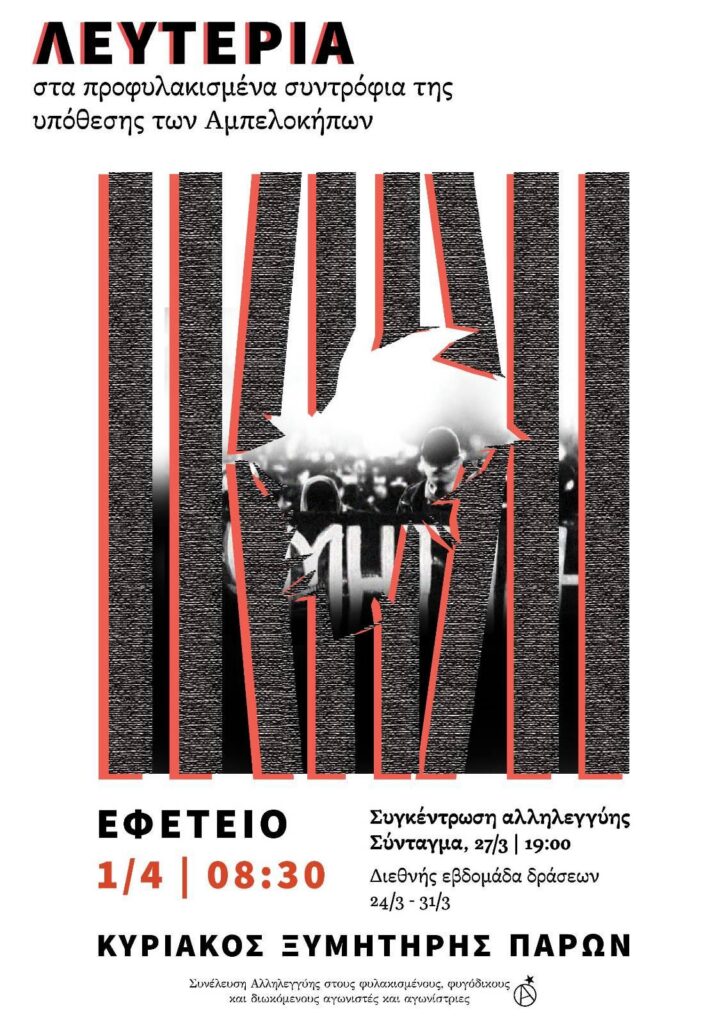 Την Κυριακή 29/3, στις 17:00, στο πάρκο Ναυαρίνου, συμμετέχουμε σε εκδήλωση που συνδιοργανώσαμε με την Δομή υλικής και πολιτικής στήριξης διωκόμενων αγωνιστών/στριών και την Αυτοοργανωμένη δομή υγείας εξαρχείων, με θέμα τις συλλογικές μορφές αλληλοβοήθειας στον δρόμο. Θα συζητήσουμε συμβουλές για το πριν, το κατά τη διάρκεια και το μετά μίας πορείας, και το ζήτημα του φακελώματος στα νοσοκομεία, και θα γίνει ένα σύντομο εργαστήρι πρώτων βοηθειών για πορείες. Ακολουθεί η αφίσα και το κάλεσμα της Δομής υλικής και πολιτικής στήριξης διωκόμενων αγωνιστών/στριών: Εκδήλωση-Συζήτηση ΚΥΡΙΑΚΗ 29/3 ΣΤΙΣ 17:00 ΣΤΟ ΑΥΤΟΔΙΑΧΕΙΡΙΖΟΜΕΝΟ ΠΑΡΚΟ ΝΑΥΑΡΙΝΟΥ Συλλογικές μορφές αλληλοβοήθειας στον δρόμο Ενάντια στην συνεργασία μπάτσων […]
