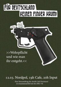 12.03.2026 | 19h Doors, 20h Input | Nordpol Mehr als doppelt so viele Menschen wie im Vorjahr verweigerten 2025 den Kriegsdienst. Angesichts der Debatten um die Einführung einer neuen Wehrpflicht vielleicht schon im kommenden Jahr wollen viele junge Menschen ein Zeichen setzen und deutlich machen: Ich bin nicht bereit, mich in militärische Strukturen zwingen zu lassen und in den Krieg zu ziehen. Gegen die Wiedereinführung der Wehrpflicht gingen Zehntausende auf die Straße, am 5. März findet der nächste Schulstreik statt. Eine Woche später, am Donnertag den 12. März gibt es für alle, die mehr über die Möglichkeiten der Kriegsdienstverweigerung wissen […]