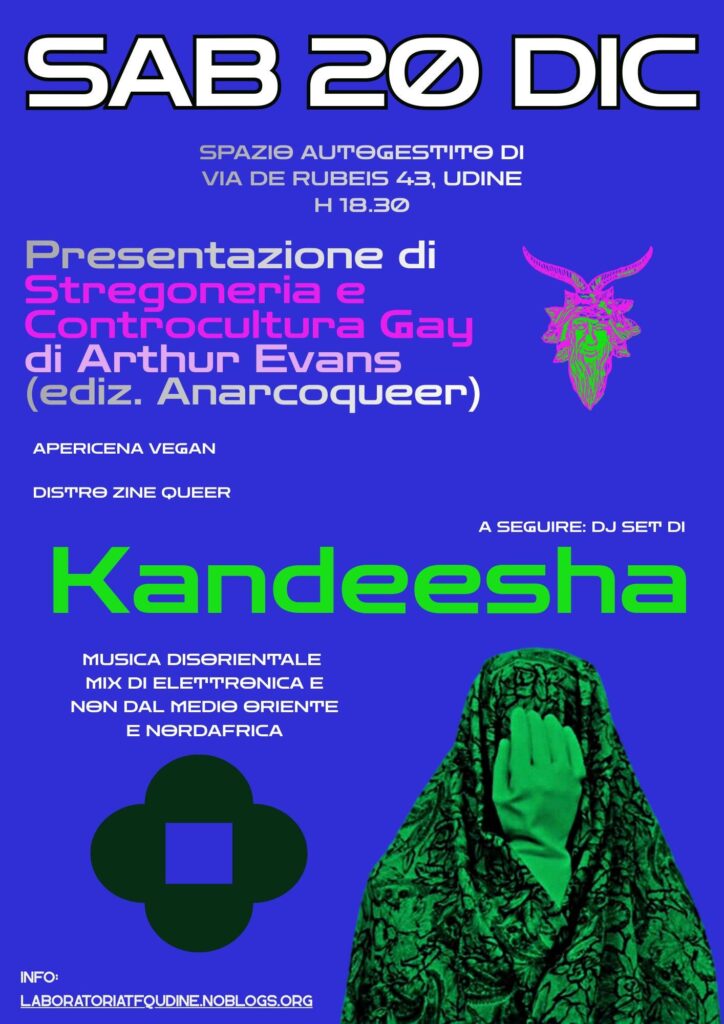 SABATO 20 DICEMBRE 2025ULTIMA INIZIATIVA DELL’ANNO (forse) della LABORATORIA PRESENTAZIONE DEL LIBRO STREGONERIA E CONTROCULTURA GAYdi ARTHUR EVANS Traduzione italiana a cura delle EDIZIONI ANARCOQUEER a seguire APERICENA VEGAN e DJ set di KANDEESHA https://soundcloud.com/kandeeshache ci farà muovere con la sua musica DISORIENTALE, mix di musica elettronica e non dal MedioOriente e Nord Africa! Sul libro..Questo libro-cult degli anni ‘70, per la prima volta reso disponibile aun pubblico di lingua italiana, parla di riti pagani, sesso gay, orgesacre e stregoneria. Parla di come il cristianesimo abbia cercato diannientare quelle forme di spiritualità legate alla venerazione dellanatura e alla celebrazione gioiosa […]