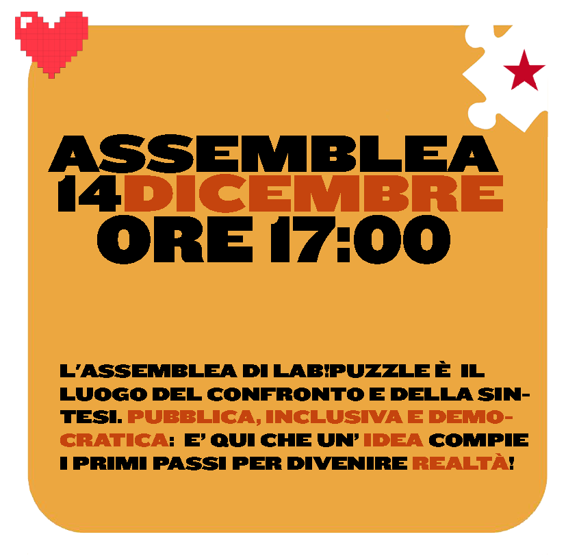 🏠𝐋’𝐀𝐒𝐒𝐄𝐌𝐁𝐋𝐄𝐀L’assemblea di Lab!Puzzle è libera, pubblica, democratica, antifascista, antisessista e antirazzista, prerogative che riteniamo indispensabili per il vivere civile ed un confronto sano. Si tiene ogni prima domenica del mese alle ore 17:00, salvo quando diversamente specificato. ✏️ 𝐎𝐑𝐃𝐈𝐍𝐄 𝐃𝐄𝐋 𝐆𝐈𝐎𝐑𝐍𝐎:L’odg si redige in mailing list ed è in continuo aggiornamento. Per iscriversi occorre partecipare ad almeno un’assemblea. 📍Autogestione del II piano del Lab!Puzzle e dell’aulastudio: responsabilità collettiva, buone pratiche e progettualità 📍Incontro con Davide, ricercatore del Dipartimento di Architettura e Studi Urbani del Politecnico di Milano: Lab!Puzzle come caso studio. La sua ricerca si pone l’obiettivo d’indagare le forme […]