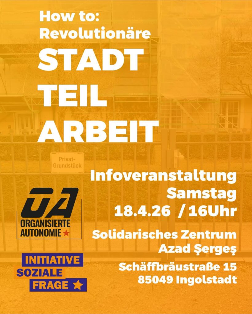 Am Samstag den 18.4. laden wir, die Initiative soziale Frage, ab 16uhr ins solidarische Zentrum Azad Şergeş zu einer Infoveranstaltung mit dem Thema „How to: Revolutionäre Stadtteilarbeit“ ein. Wir haben Genoss*innen der Organisierten Autonomie eingeladen damit diese uns darüber erzählen wie Revolutionäre Stadtteilarbeit im Detail aussehen kann, welche Herausforderungen es dabei gibt und was ihre Erfahrungen damit sind. Die Organisierte Autonomie ist inzwischen in Stuttgart, Nürnberg und Schwäbisch Gmünd vertreten und zum Teil seit Jahrzehnten in den jeweiligen Vierteln präsent und direkt an der Basis aktiv. Wir freuen uns über einen interessanten Austausch und eine lebhafte Diskussion. Es ist keine […]