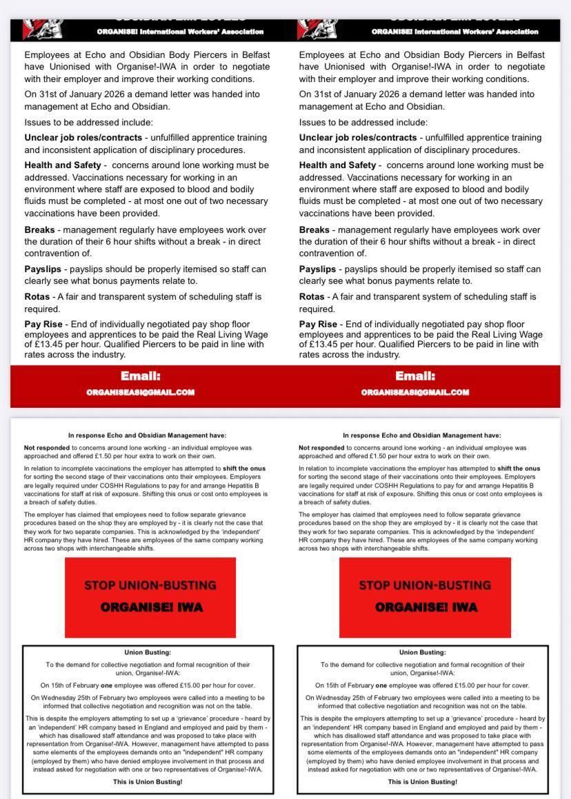 Our sister organisation in the International Workers Association Organise/IWA starts a campaign against owners of two tattoo studios in Northern Ireland (Solidarity Federation Hospitality Workers Union)