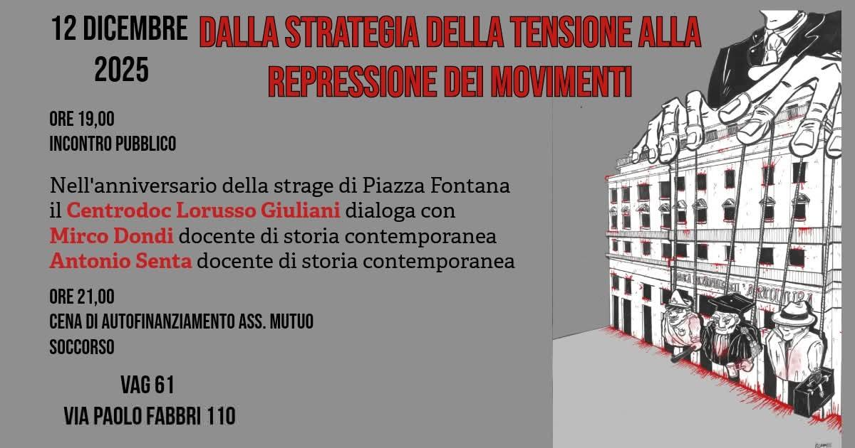 VENERDÌ 12 DICEMBRE’025 Il 12 dicembre 1969, con le bombe a Piazza Fontana a Milano si innescò una “strategia della tensione” pensata ed usata come forma di governo dei conflitti sociali. Una vera e propria guerra praticata dallo Stato contro le istanze dei movimenti, attuata attraverso l’utilizzo dello stragismo fascista da parte degli apparati statali.A partire da quei giorni il modello repressivo statale si è sempre “adattato” al livello di scontro sollevato dalle lotte e dai conflitti. Per sconfiggere i movimenti le tecniche repressive si sono sempre più affinate: una lunga catena di provvedimenti che parte con legge Reale del […]