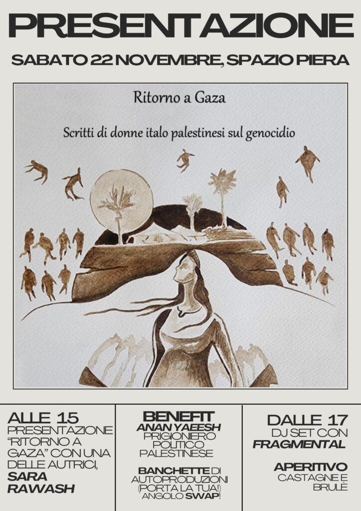 Diffondiamo SABATO 22 NOVEMBRE – Spazio Piera (Via Lavisotto 9, Trento) Ore 15 Presentazione del libro Ritorno a Gaza (scritti di donne italo palestinesi) con una delle autrici, Sara Rawash A seguire, dj set con Fragmental, castagne e brûlé benefit per Anan Yaeesh, prigioniero politico palestinese Per tutto il tempo ci sarà anche un angolo swap e uno con banchette di autoproduzioni (tuttx benvenutx a partecipare con le proprie!) Femminismo e anticolonialismo non sono due percorsi distinti. Sono la stessa lotta. PALESTINA LIBERA!