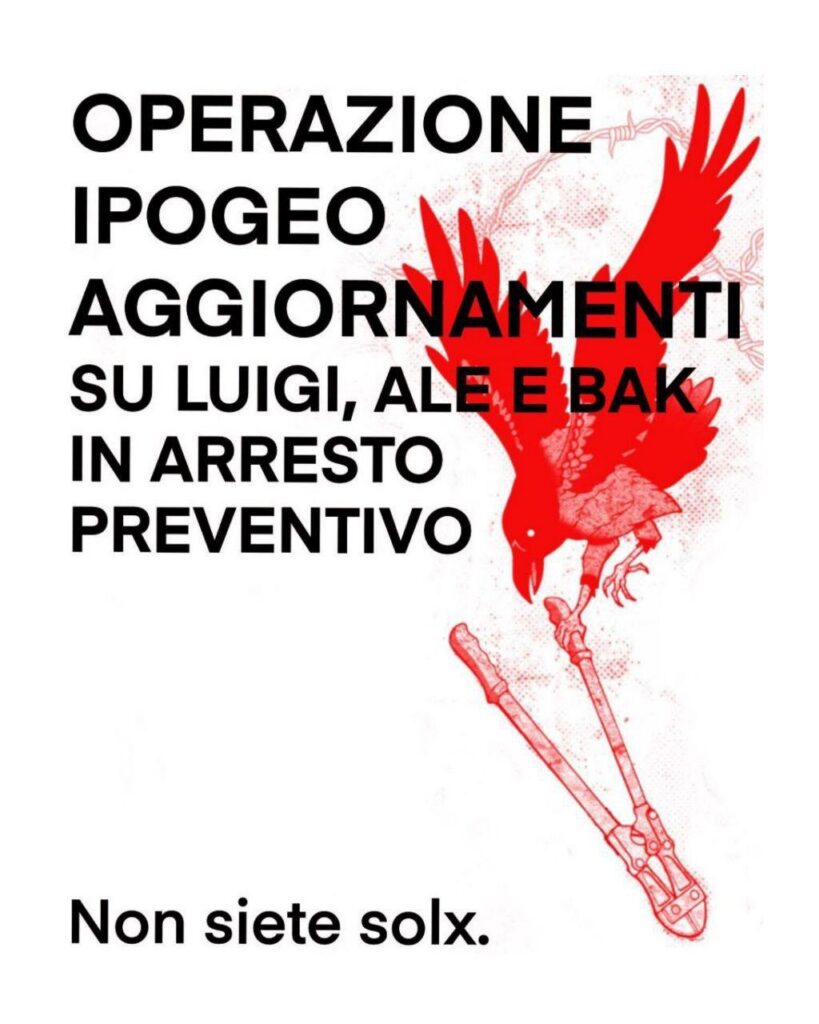 Diffondiamo È passato più di un mese e mezzo da quando lx nostrx amicx Luigi, Ale e Bak sono statx arrestatx nel corso dell’Operazione Ipogeo, condotta dalla Procura di Catania lo scorso 20 novembre. Da allora, Luigi e Ale si trovano incarcerati nella gabbia di Piazza Lanza a Catania. Bak in quella di Brindisi. I loro arresti preventivi sono volti a colpire la contestazione al ddl sicurezza adottato lo scorso anno dal governo e contro il quale, il 17 maggio, si è svolto un corteo a Catania, proposto dalla rete cittadina contro il ddl 1660. Come sta accadendo ovunque in […]