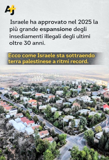 da un post di Freedom Flotilla su fb, 17 dic. 2025: Israele ha approvato la più grande espansione degli insediamenti illegali degli ultimi 30 anni nei Territori Palestinesi Occupati. Un atto che viola il diritto internazionale. Gli insediamenti israeliani: – violano l’art. 49(6) della IV Convenzione di Ginevra (trasferimento della popolazione della Potenza occupante) – sono dichiarati illegali dalla Corte Internazionale di Giustizia nel Parere consultivo del 2004 sul Muro – costituiscono appropriazione illegale di territorio e frammentazione forzata della popolazione occupata – impediscono l’esercizio del diritto all’autodeterminazione del popolo palestinese Nel Parere consultivo della Corte Internazionale di Giustizia del 2024, […]