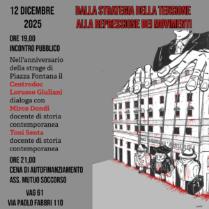 Venerdì 12 dicembre 2025 a Vag61, via Paolo Fabbri 110, Bologna “Dalla strategia della tensione alla repressione dei movimenti” Ore 19.00 incontro pubbico: nell’anniversario della strage di Piazza Fontana il Centrodoc Lorusso Giuliani dialoga con: – Mirco Dondi, docente di storia contemporanea – Toni Senta, docente di storia contemporanea Ore 21.00 cena di autofinanziamento dell’associazione di Mutuo soccorso