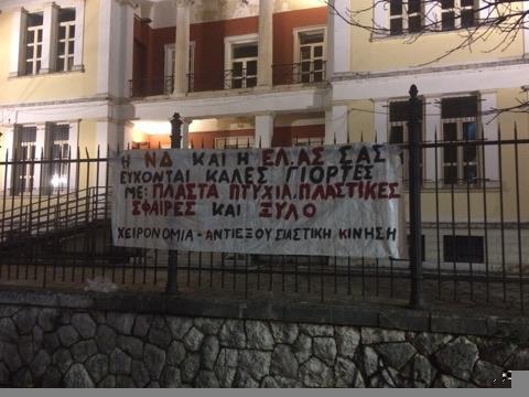 Χειρονομία-Αντιεξουσιαστική Κίνηση: Η Ν.Δ και η ΕΛ.ΑΣ. σας εύχονται καλές γιορτές (Ιωάννινα) (No squatter in prison!)