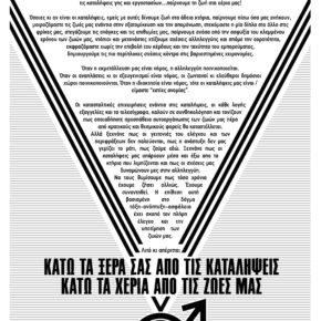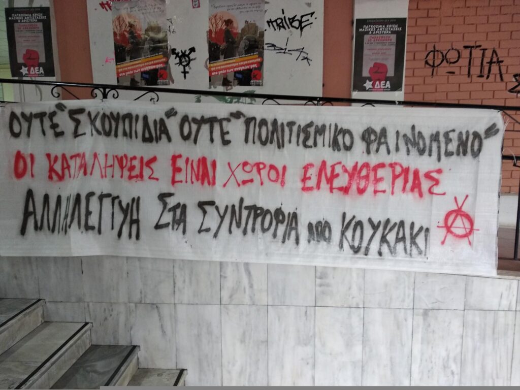 Αλληλεγγύη στις καταλήψεις. Τους τελευταίους μήνες, μετά και την καλοκαιρινή αλλαγή πολιτικής διαχείρισης, το κράτος έχει εξαπολύσει μια νέα κατασταλτική εκστρατεία απέναντι στις δομές του κινήματος και στα αυτοοργανωμένα εγχειρήματα. Οι τελευταίες εκκενώσεις διαδραματίστηκαν , μετά το τέλος του περιβόητου τελεσιγράφου, στην γειτονιά του Αμαρουσίου με την εκκένωση της κατάληψης Έπαυλης Κουβέλου αλλά και στη γειτονιά του Κουκακίου όπου εκκενώθηκαν τρείς καταλήψεις της Κοινότητας Καταλήψεων Κουκακίου (Ματρόζου, Παναιτωλίου, Αρβάλη). Στο Μαρούσι όταν οι κατασταλτικές δυνάμεις εισέβαλλαν στην κατάληψη στις 17.12, η πρώτη άμεση αντακλαστική απάντηση δόθηκε με την δυναμική παρέμβαση συντρόφων/ισσών στο Δημαρχείο καθιστώντας την τοπική αυτοδιοίκηση συνυπεύθυνη για την […]
