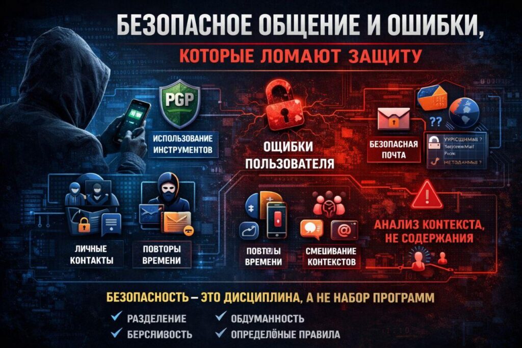 В предыдущем материале мы разобрали базовые принципы безопасного общения: выбор почты, мессенджеров и общее понимание шифрования. Однако на практике большинство проблем возникает не из-за отсутствия инструментов, а из-за непонимания логики их применения. Шифрование не защищает автоматически. Оно работает только тогда, когда человек понимает, что именно он защищает, от кого и в какой момент. Главная иллюзия: «если зашифровано — значит безопасно» Самая распространённая ошибка — уверенность, что использование PGP, защищённой почты или «приватного» мессенджера автоматически решает проблему. На практике утечки происходят из-за: неправильного поведения; неосторожного контекста; смешивания ролей и каналов; оставленных цифровых следов. Инструмент не компенсирует ошибку пользователя. Безопасная почта — […]