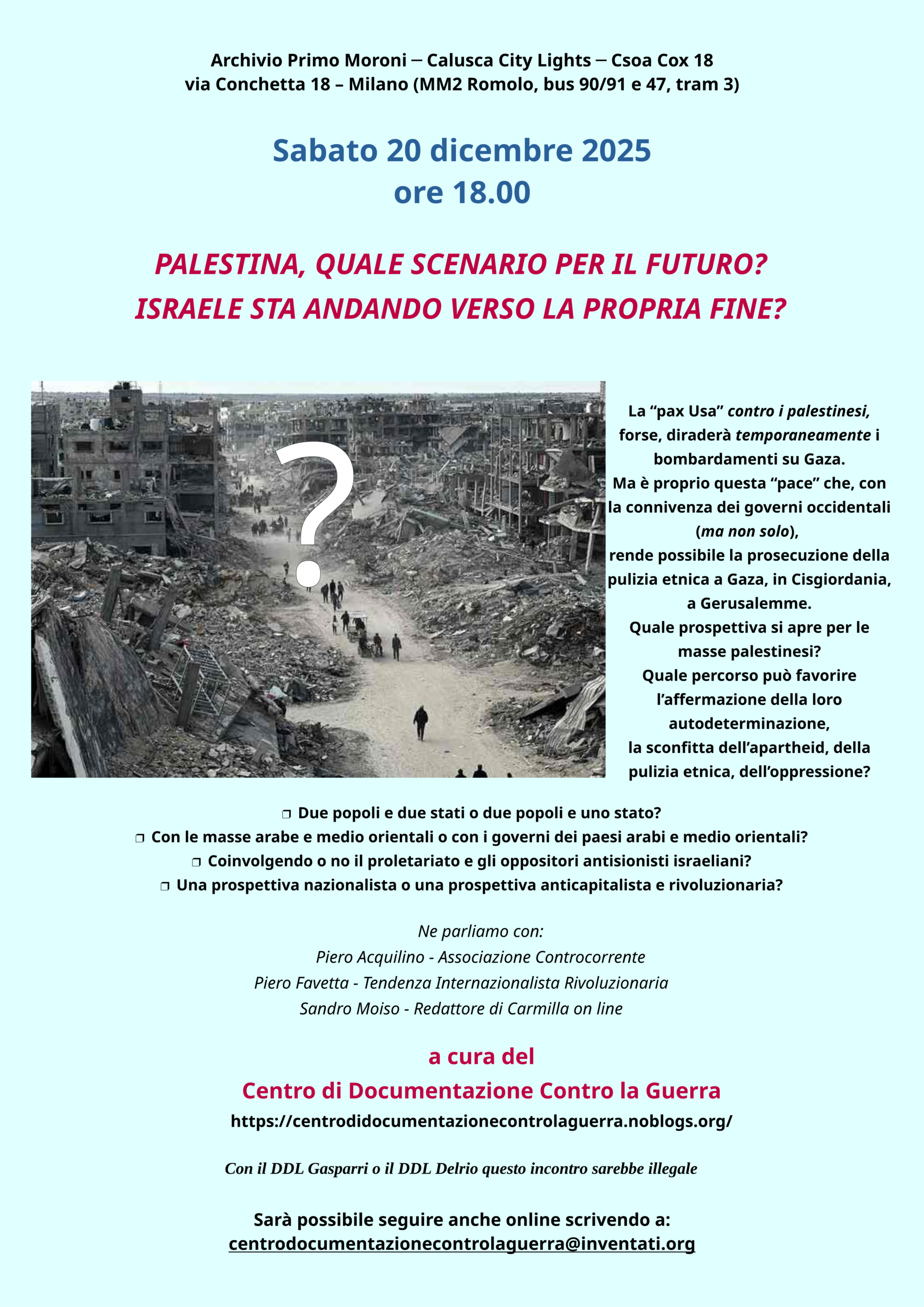 Sabato 20 dicembre 2025 ore 18.00 PALESTINA, QUALE SCENARIO PER IL FUTURO? ISRAELE STA ANDANDO VERSO LA PROPRIA FINE? La “pax Usa” contro i palestinesi, forse, diraderà temporaneamente i bombardamenti su Gaza. Ma è proprio questa “pace” che, con la connivenza dei governi occidentali (ma non solo), rende possibile la prosecuzione della pulizia etnica a Gaza, in Cisgiordania, a Gerusalemme. Quale prospettiva si apre per le masse palestinesi? Quale percorso può favorire l’affermazione della loro autodeterminazione, la sconfitta dell’apartheid, della pulizia etnica, dell’oppressione? • Due popoli e due stati o due popoli e uno stato? • Con […]