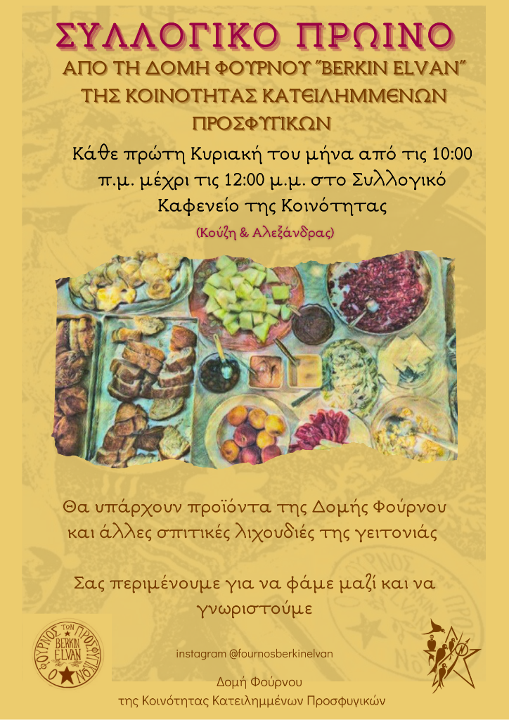 Συλλογικό πρωινό από τη Δομή Φούρνου των Προσφυγικών Εδώ και 12 χρόνια, στη Δομή Φούρνου “Berkin Elvan” της Κοινότητας Κατειλημμένων Προσφυγικών, ζυμώνουμε κάτι παραπάνω από το ψωμί της γειτονιάς μας. Όπως και σε όλες τις αυτοοργανωμένες δομές της Κοινότητας, ζούμε μια συλλογική κουλτούρα αντίστασης και έναν συλλογικό τρόπο ζωής που μας ενδυναμώνει, κόντρα στην καταπίεση και την απομόνωση που υπάρχει παντού γύρω μας. Μέσα από τα όνειρα και τις κοινές μας αξίες, χτίζουμε τη ζωή που θέλουμε να ζούμε. Μια ζωή κοινοτική, με την αυτοοργάνωση, την αλληλεγγύη και τη συντροφικότητα στον πυρήνα της. Μοιραζόμαστε όχι μόνο τις ανάγκες μας αλλά […]