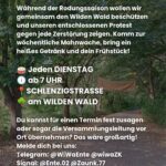 Während der Rodungssaison wollen wir gemeinsam den Wilden Wald beschützen und unseren entschlossenen Protest gegen jede Zerstörung zeigen. Komm zur wöchentlichen Mahnwache, bring ein heißes Getränk und dein Frühstück mit!Ort: Schlenzigstraße Ecke Hornatsdeicher WegDu kannst für einen Termin fest zusagen oder sogar die Versammlungsleitung vor Ort übernehmen? Das wäre großartig, melde dich bei uns!