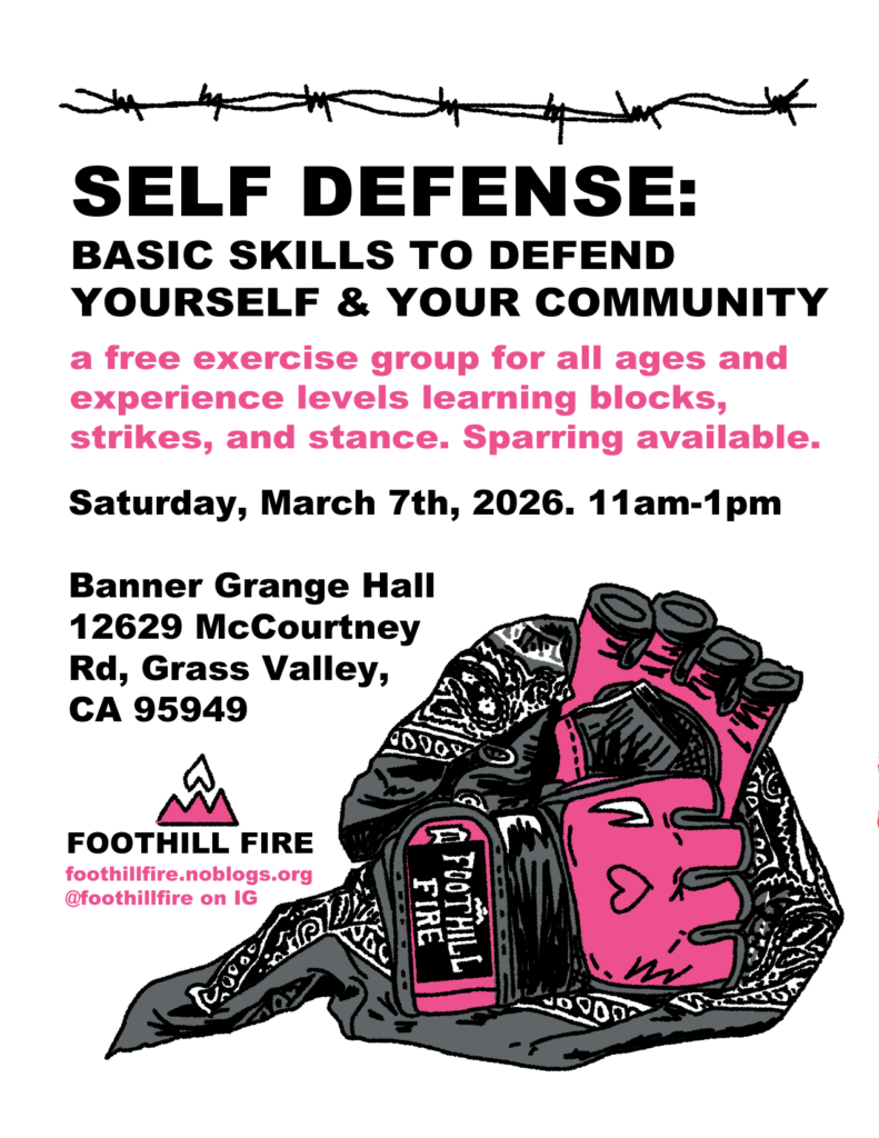 Hello and welcome to the Foothill Fire website. Looking to contact us? Our instagram is @foothillfire and foothillfire@proton.me is our email. UPCOMING EVENTS: Self Defense Saturday, March 7th, 11am-1pm at the Banner Grange Hall (see post below). May Day, May 1st, 2026, at the Oddfellows Hall in Nevada City. The shortest possible description of us is this: we’re an organization of anarchists and communists fighting for a stateless, classless society. We host skillshares and talks and shows and we also make art and zines. Speaking of zines, here is our current selection: ༺•༻❀༺•༻ ZINES “Zine” is short for “magazine”. They’re […]