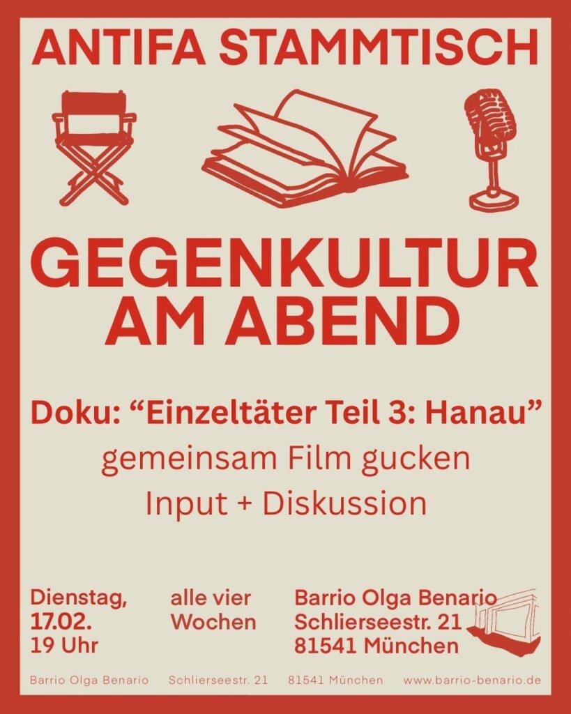 (de) Café Lokal/Mit uns kein Krieg! – Wichtige Protagonist*innen für die feministisch anti-militaristische Geschichte & Bewegung in München und darüber hinaus 🟢 Freitag, 20. März; 19:00 Küfa, 19:30 Vortrag; Ligsalzstraße 8, 80339 München 📍Als nächstes in unserer Veranstaltungsreihe „Mit uns kein Krieg!“ sprechen wir mit Ingrid Scherf über: Berta von Suttner und Clara Zetkin in der Frauenfriedensbewegung vor und nach dem ersten Weltkrieg; über Lida Gustava Heymann und Anita Augsburg in der Münchner Räterepublik; über feministische autonome Strukturen der 70er Jahre. Wir wollen keine lineare Geschichte erzählen, aber Geschichten von kämpfenden Frauen und queers hören, die in München vor uns gewirkt […]