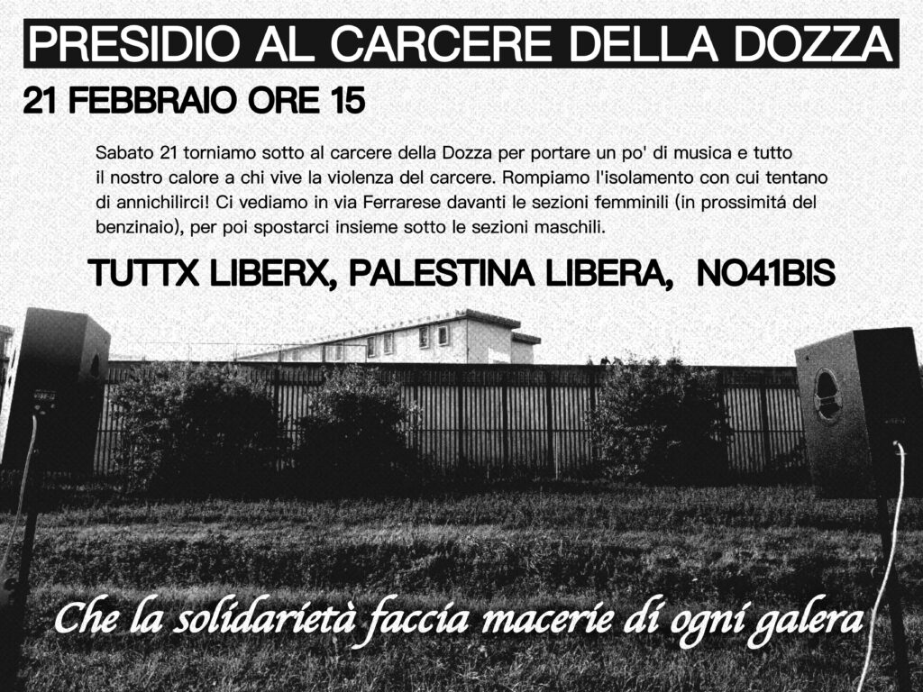 Carcere di Melfi 21 febbraio ore 15 presidio al carcere di Melfi contro la sentenza di condanna per Anan – Per esprimere solidarietà e vicinanza ad Anan e a tutti i prigionieri politici palestinesi – contro la montatura per Hannoun – contro la repressione del movimento palestinese e del movimento di solidarietà con la Palestina La resistenza non è reato, la solidarietà è un’arma non un reato! Liberi tutti! Palestina libera! Da Taranto delegazione con mezzo collettivo per info e adesioni #iostoconlaPalestina Taranto c/o slai cobas taranto wa 3519575628