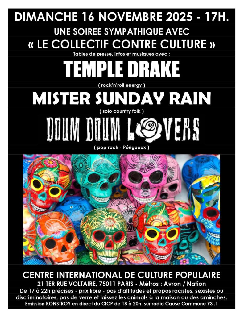 SOIREE AVEC LE COLLECTIF CONTRE CULTURE DOUM DOUM LOVERS (duo mixte rock Perigueux)TEMPLE DRAKE (paris – garage rock mixte)MISTER SUNDAY RAIN (country folk solo)