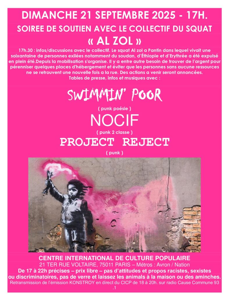 SOIREE DE SOUTIEN AU SQUATT MIGRANTS « AL ZOL » EXPULSE AVANT L ‘ETE 17h.30 : infos/discussions avec le collectif. Le squat Al zol a Pantin dans lequel vivait une soixantaine de personnes exilées notamment du soudan, d’Éthiopie et d’Erythrée a été expulsé en plein été.Depuis la mobilisation s’organise. Il y a entre autre besoin de trouver de l’argent pour pérenniser quelques places d’hébergement et éviter que les personnes sans aucune ressources ne se retrouvent une nouvelle fois a la rue. Des actions a venir seront annoncées.Tables de presse, infos et musiques avec : SWIMMIN’ POOR( punk poésie )NOCIF( punk 2 classe […]