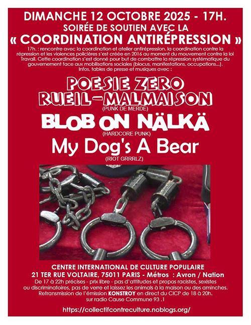 SOIREE SOUTIEN A LA COORDINATION ANTIREPRESSION 17H: rencontre avec la coord et atelier antirep.La Legal Team Paris lutte depuis 2016 pour que personne ne soit seul·eface à la police et à la justice. Défense collective, solidarité etrésistance : nos avocat·e·s sont financé·e·s par une cagnotte communepour défendre toutes celles et ceux visé·e·s par la répression :https://kutt.it/stoprep.Nous proposons de revenir sur la repression qui a frappé la mobilisationdes 10 et 18 septembre au cours d’un atelier afin de mieux comprendreles rouages de la repression à partir de ce qui s’est passé ces jours laet suivants. POESIE ZERO (punk rock)BLOB ON NALKA […]