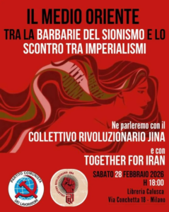 28 Febbraio 2026 – ore 18,00 Il Medio Oriente – tra la barbarie del sionismo e lo scontro tra imperialismi [archiveorg il-medio-oriente-28-02-2026 width=640 height=30 frameborder=0 webkitallowfullscreen=true mozallowfullscreen=true] Il Medio Oriente è stretto tra la barbarie del sionismo, dei suoi regimi reazionari e lo scontro mondiale tra imperialismi che si contendono potere, risorse e influenza. Se l’imperialismo americano è l’oppressero fondamentale in questa regione, nessuna potenza è neutrale: tutte alimentano guerra e devastazione sulla pelle dei popoli. Di fronte a occupazione, colonialismo e rivalità tra blocchi, serve un’analisi di classe e internazionalista. Perché contro ogni imperialismo, l’unica prospettiva è la solidarietà tra […]