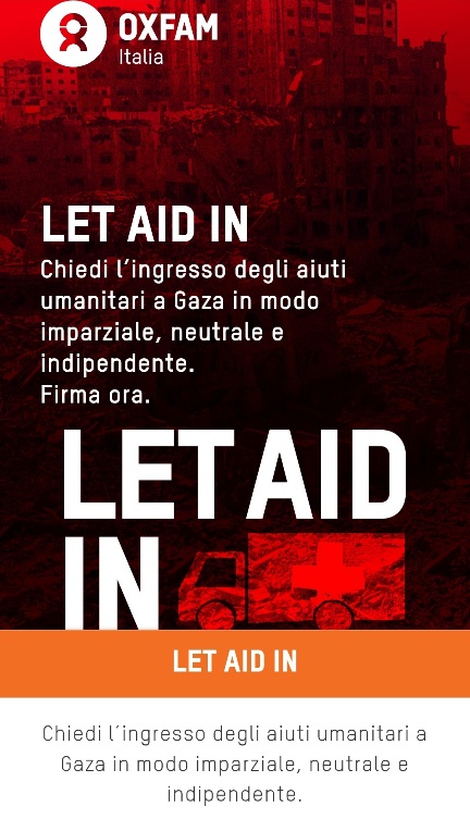 https://www.oxfamitalia.org/petizione/gaza-let-aid-in/ Il governo israeliano ha permesso a poche decine di camion di entrare nella Striscia, … Nel pieno disprezzo della vita e del diritto internazionale umanitario. Negare il cibo, l’acqua, il carburante e l’elettricità alla popolazione di Gaza è un crimine di guerra e contro l’umanità.