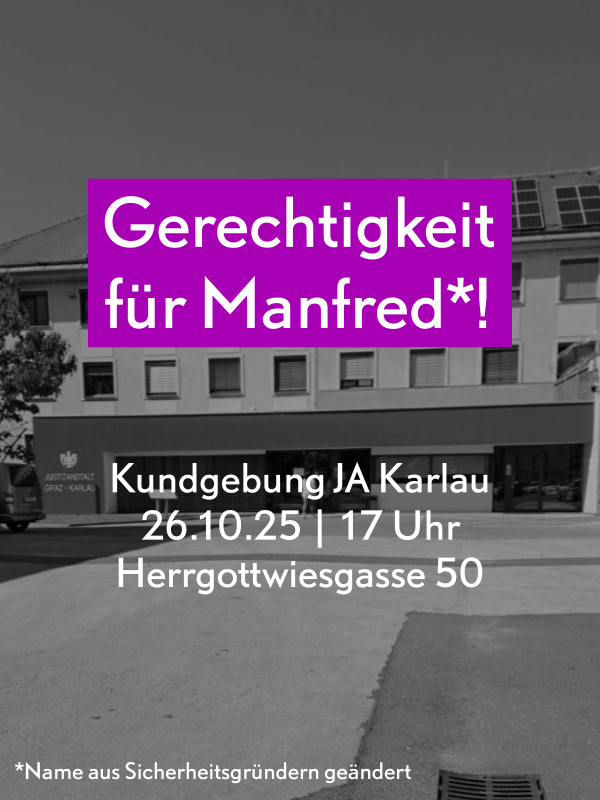 Kundgebung am Sonntag, 26.10., 17 Uhr vor der JA Karlau *Name aus Sicherheitsgründen geändert Manfred braucht dringend einen Anwalt und wir brauchen dafür Geld! Spende jetzt: https://www.goodcrowd.org/gerechtigkeit-fuer-manfred Die Missstände in der JA Karlau sind enorm. Vergangenen Juni und auch im Oktober gab es dazu einen Protest vor der JA Karlau. Verschiedene Gruppen (zB Gefangenengewerkschaft, Inmates … weiterlesen