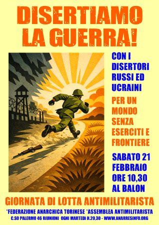 Com os desertores russos e ucranianos por um mundo sem exércitos e fronteiras Sábado, 21 de fevereiro jornada de informação e luta antimilitarista às 10h30 no Balon Já se passaram quatro anos desde a violenta aceleração da guerra impulsionada pela invasão russa da Ucrânia. O conflito está cada vez mais duro: os mortos são centenas […]