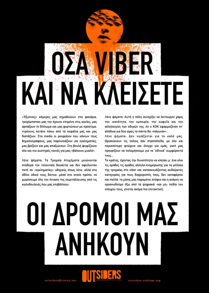 ΟΣΑ VIBER ΚΑΙ ΝΑ ΚΛΕΙΣΕΤΕ ΟΙ ΔΡΟΜΟΙ ΜΑΣ ΑΝΗΚΟΥΝ «Έξυπνες» κάμερες μας σημαδεύουν στα φανάρια, τροχόμπατσοι μας την έχουνε στημένη στις γωνίες, μας αρπάζουν το δίπλωμα και μας φορτώνουν με πρόστιμα, ντρόουνς πετάνε πάνω από τα κεφάλια μας και μας διατάζουν. Στα media οι ρουφιάνοι που κάνουν τους δημοσιογράφους, μας παρουσιάζουν για εγκληματίες, μας βρίζουν και μας απαξιώνουν. Στη βουλή ψηφίζουνε όλο και πιο αυστηρές ποινές για να μας «βάλουνε μυαλό». Λένε ψέματα: Τα Τροχαία Ατυχήματα μειώνονται σταθερά την τελευταία δεκαετία και δενοφείλονταν ποτέ σε «εγκληματίες» οδηγούς όπως λένε, αλλά στο άθλιο οδικό τους δίκτυο, μέσα στο οποίο πρέπει […]