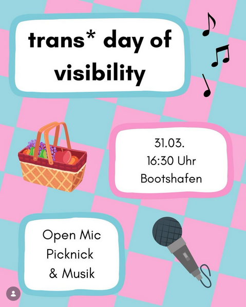 Am 31.03. ist trans* day of visibility und dieses Jahr wollen wir ihn gemeinsam am Bootshafen verbringen. 🏳️⚧️ Mit einem Open Mic, Picknick und Musik wollen wir es uns gemütlich machen. Dieses Mal wollen wir vor allem positive Erfahrungen teilen, … Weiterlesen