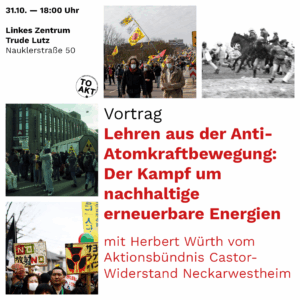 Vortrag „Lehren aus der Anti-Atomkraftbewegung – Der Kampf um nachhaltige erneuerbare Energien“ mit Herbert Würth Im Rahmen der Ausstellung „Klimabewegung: Ursprünge, Höhepunkte, Perspektiven“ 31.10. | 18 Uhr | Nauklerstraße 50 Die Anti-Atomkraftbewegung hat viel erreicht: Von riesigen Menschenketten über die Blockade von Atomtransporten bis hin zum Atomausstieg. Atomkraft ist heute in Deutschland eine nicht mehr genutzte vermeintlich nachhaltige Energiequelle. Doch was heißt das für die Energiegewinnung heute und wie konnte es zu diesem gigantischen Erfolg kommen? Was wurde nicht erreicht? Herbert Würth vom Aktionsbündnis Castor-Widerstand Neckarwestheim berichtet über die Erfahrungen, Erfolge und Fehler der Anti-Atomkraftbewegung und was wir heute davon […]
